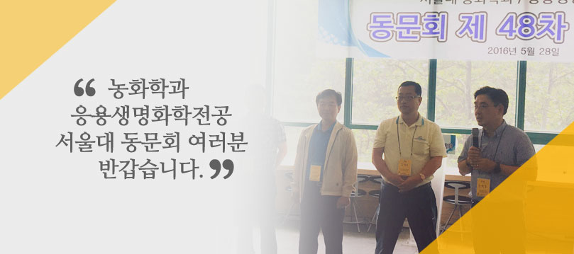 안녕하십니까. 동문님들의 건승과 가내 평안하심을 기원합니다. 1946년 서울대 농화학과 설립 이후 우리학과 선, 후배 동문님들은 각계에서 훌륭한 역할을 수행하시어 우리학과의 명예를 드높이고 계십니다. 동문회 결성이후 우리 동문회는 선배님들의 지대하신 관심과 노력으로 어언 과반세기에 이르게 되었습니다. 그렇지만 과명의 변경이후 후배 동문님들의 동문회 가입이 급감하여 동문회 회원 숫자의 자연발생적인 축소현상이 발생하기에 이르렀습니다.