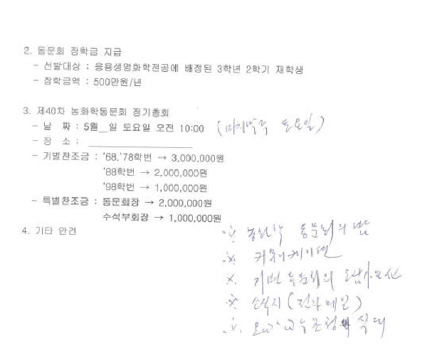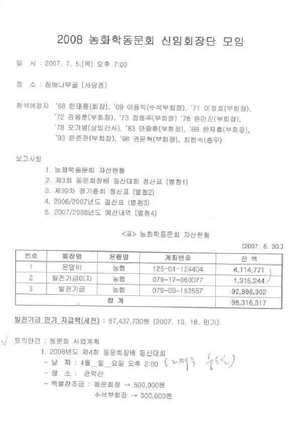 2008 회기 농화학과 동문회 회장단 1 차 모임의 회의록 입니다.
